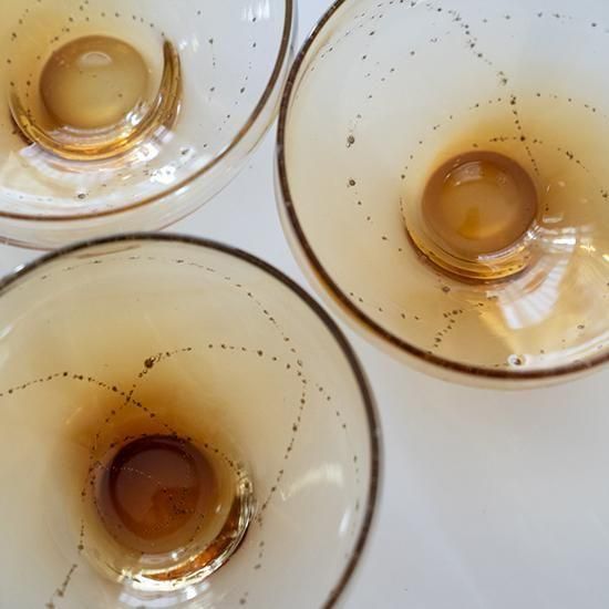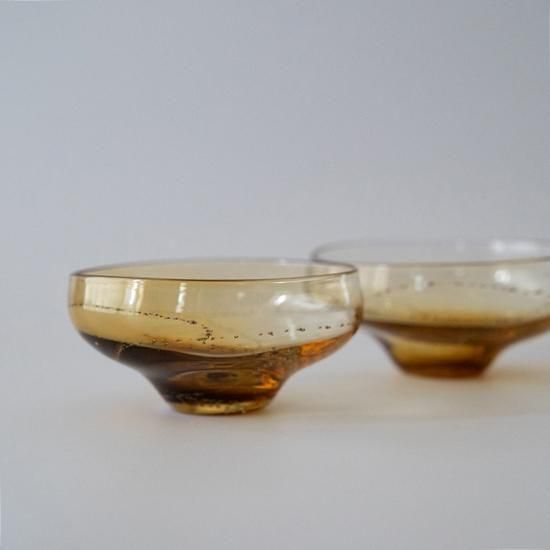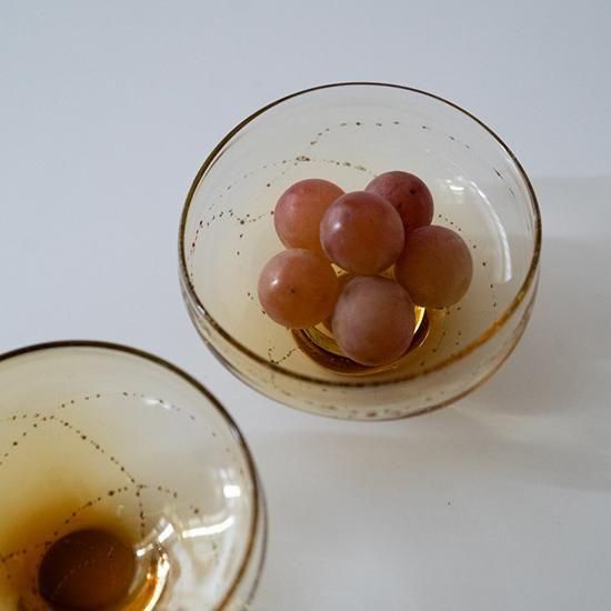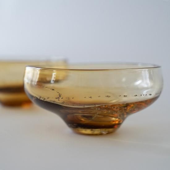 透明ガラスの「てんてん星」シリーズ。 泡の星屑は、真鍮線が溶けたあと。 自由に動くガラスを生かし、やさしく包み込むような空気感を醸します。 おもてなしの席から日常まで。 テーブルを品よくドレスアップしてくれる、シックな琥珀色の小鉢。 お料理からデザートまで。 季節を問わず使いたい器です。 素材 : クリアガラス(非耐熱) サイズ : ≒φ120-123 × h60 mm *素材は非耐熱ガラスです。高温でのご使用や洗浄などは不可のためご注意ください。 ◆「てんてん星」シリーズは、星(真鍮)の入り方が一つずつ異なります。 また、サイズやフォルムに個体差があります。 複数ご注文の場合は、可能な範囲で近似のものをご用意します。