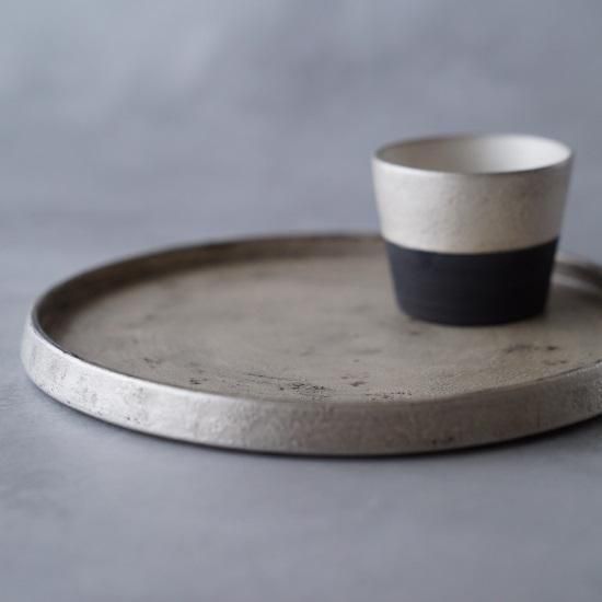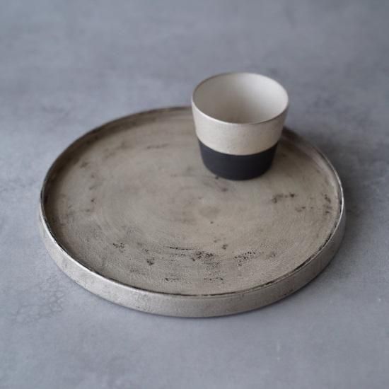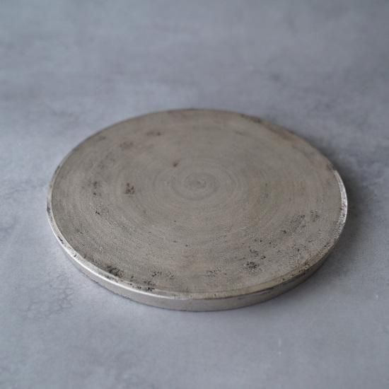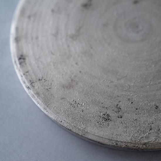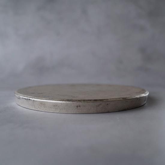 黒の釉薬に銀彩を重ねた仕上げは、経年で銀が磨れると、下地の黒が朧げに覗きます。 まるで漆器の味わいのような、“錆銀彩”。 経年変化しながらも扱い易い銀彩です。 エッジの効いた台皿は、裏に返せば盛り皿に。 和洋、お料理に、お菓子に。 プロに愛される名作の器。 素材 : 磁器 size : ≒φ225×h17 mm 《錆銀彩について》 銀の色は経年変化により、シャンパンゴールド〜黄褐色〜黒褐色(燻銀)へと変化(硫化)します。重曹などでのお手入れによりある程度銀色を保つことはできますが、色を育てながら器を使う過程もお愉しみください。 *電子レンジでの使用、漂白剤の使用は、銀を黒く変色させるためお避けください。 *卵料理など硫黄成分を含む食品も、同様に変色が起こりますのでご注意ください。 その他お取扱いにつきましては、「モノとの上手なおつき合い」をご覧ください。 *黒と銀の表情などに個体差があります。このシリーズの特性としてお愉しみください。